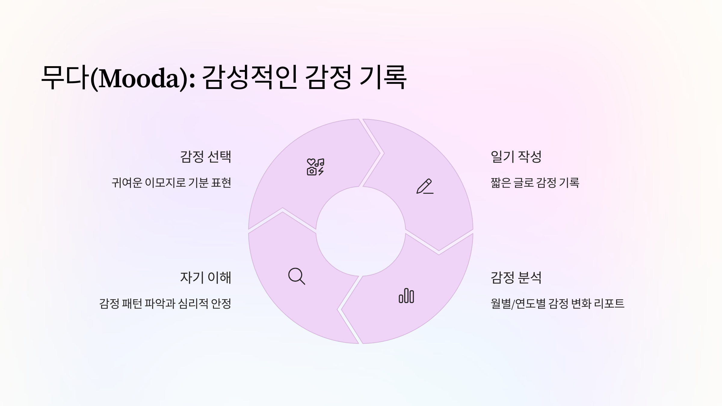 무다는 감정 기록(Mood Tracking)에 초점을 맞춘 미니멀하고 감성적인 디자인의 앱입니다. 복잡한 기능 대신, 그날의 기분을 대표하는 귀여운 이모지를 하나 선택하고 짧은 글을 덧붙이는 것만으로 간단하게 일기를 완성할 수 있습니다.